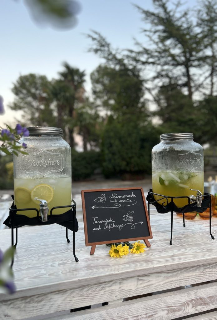 - Dispensadores con bebidas frías o carros temáticos de limonada, sangría o aguas aromatizadas.