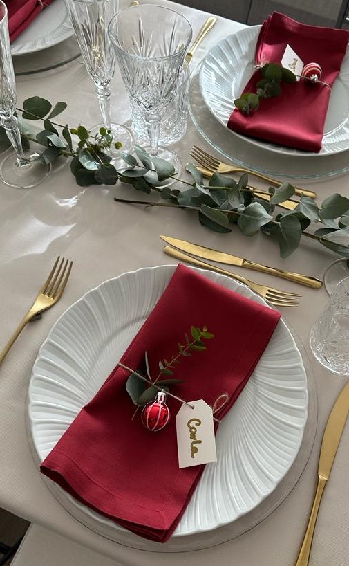 Manteles y caminos de mesa: Elige textiles con diseños o colores festivos. Los tonos dorados, granates o verdes son perfectos para la temporada navideña. Pero si quieres salir de lo tradicional recuerda que hay una gran gama de mantelerías de algodón para que tu navidad sea como tu quieres. Centros de mesa naturales: Ramas de pino, piñas, velas protegidas del viento y elementos dorados o plateados crean un ambiente navideño sofisticado. Iluminación ambiente: Guirnaldas de luces LED cálidas, faroles y velas en faroles. La iluminación es fundamental para crear atmósfera, especialmente si el brunch se extiende hasta el atardecer.