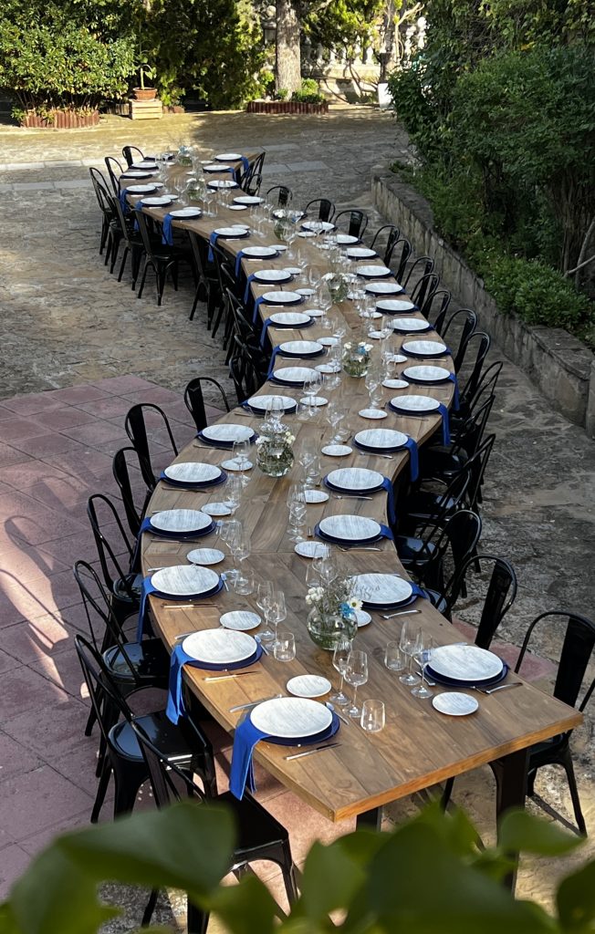- Mesas rectangulares largas: aportan un estilo elegante y señorial, perfectas para bodas rústicas o modernas.