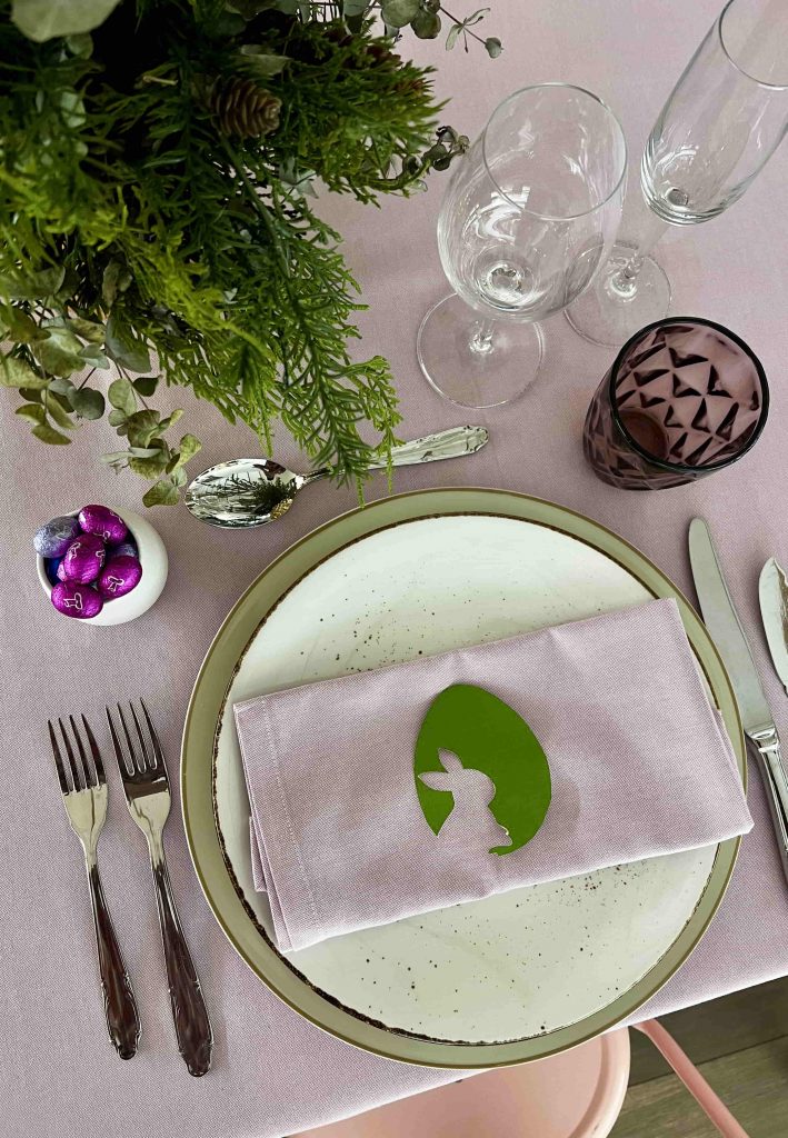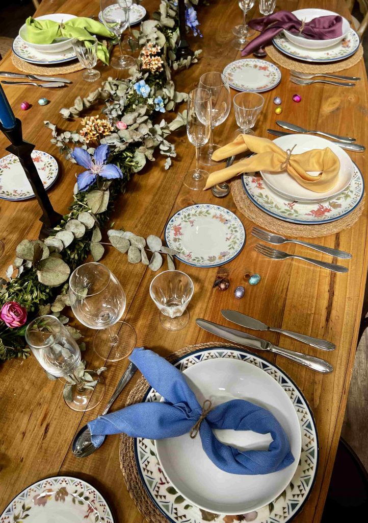 Aunque no es una tradición tan arraigada como en otros países, cada vez se ven más huevos decorados en las mesas de Semana Santa en España. Puedes vaciar huevos naturales (un poco laborioso, pero entretenido si te gusta el DIY), o simplemente comprar huevos de madera, cerámica o incluso chocolate. Pintarlos con colores suaves y colocarlos sobre un nido de paja, en una cesta o dentro de pequeños cuencos puede dar un resultado muy elegante. También puedes escribir los nombres de los comensales en ellos y usarlos como marcasitios. Un detalle bonito y fácil de hacer.Vajilla y cristalería: lo que marca la diferencia