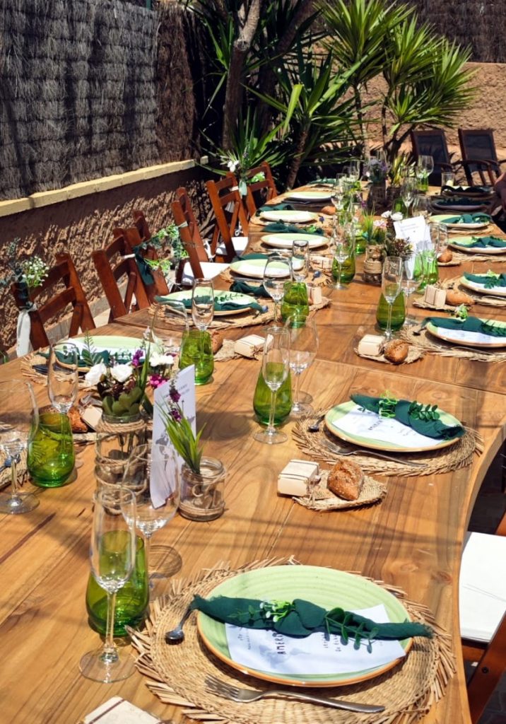 Las vajillas en tonos tierra siguen siendo las protagonistas indiscutibles. Nuestra Vajilla Arena está prácticamente siempre reservada. Su tono beige cálido funciona en cualquier estación del año y combina perfectamente con mantelerías en tonos neutros. La Vajilla Oceano, en azul claro, está siendo muy demandada para eventos de verano y celebraciones junto al mar. Ese tono azul turquesa aporta frescura sin resultar demasiado llamativo. Lo que más me gusta de estas piezas es su versatilidad. Puedes combinarlas entre sí o mezclarlas con nuestras vajillas blancas clásicas para crear mesas más dinámicas y personalizadas.
